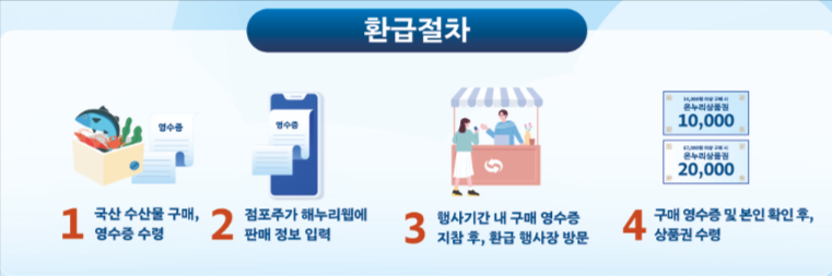 본 행사에서 국내산 수산물을 구매 후 온누리상품권으로 환급받기 위해서는 아래 절차를 따라야 합니다.