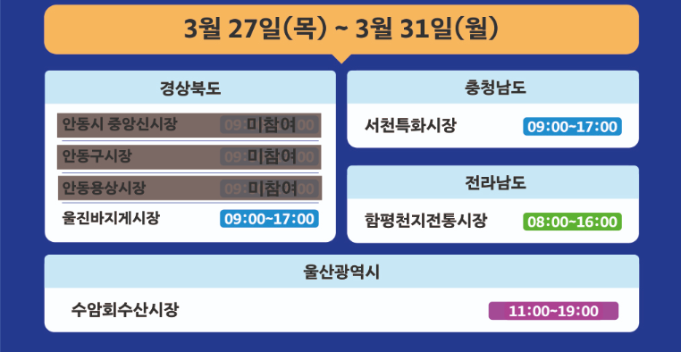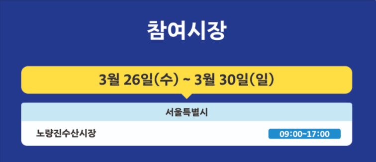 ✔ 각 시장마다 일정이 다르므로 하단 참여 시장 일정을 꼭 확인하세요!