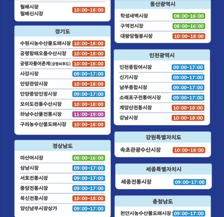 ✔ 수원시농수산물도매시장, 안양관양시장, 오이도전통수산시장 등 (경기도)
