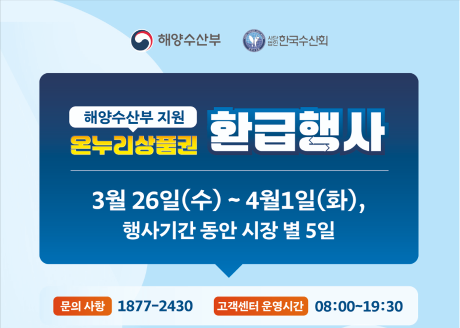 해양수산부와 한국수산회가 주관하는 2025 대한민국 수산대전에서 온누리상품권 환급행사를 진행합니다.