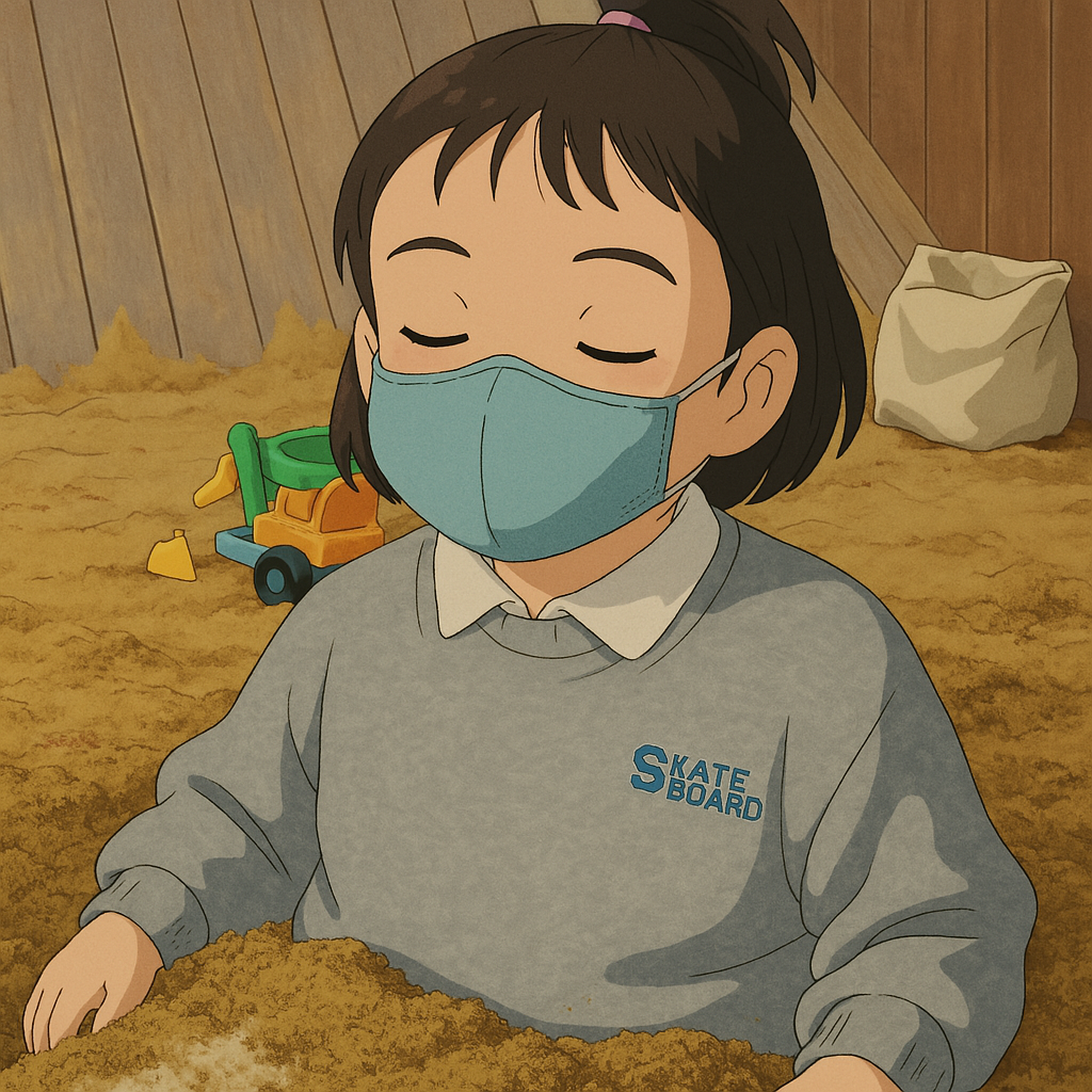 지브리 애니메이션 느낌의 장면, 장난감 가방 옆에 앉아 있는 어린아이, 마스크 착용, 부드러운 색감과 빛 표현, 일상 속 따뜻한 순간